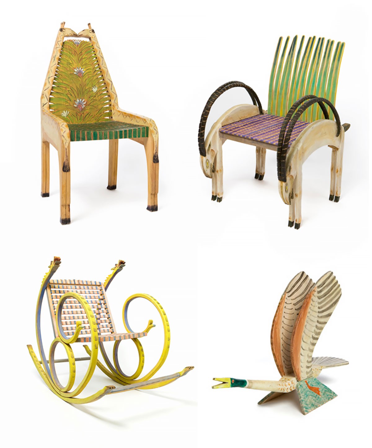 Μπουντουάρ με πελεκάνους με μακρύ λαιμό, που κρατούσαν στα ράμφη τους έναν καθρέφτη με ψάρια και στις δύο πλευρές. Γάτες που συνεχίζουν να πρωταγωνιστούν έντονα ακόμα και στα πιο πρόσφατα σχέδιά του, ενώ σε άλλα έπιπλα ο designer επεκτείνεται στις μορφές φλαμίνγκο, αντιλοπών και αρκούδων. Ένα ιδιαίτερο χαρακτηριστικό είναι ένας κόκορας με ορθάνοιχτο ράμφος, του οποίου η ουρά ταιριάζει τέλεια σε ένα επιτραπέζιο φωτιστικό, με τα φτερά να καλύπτουν τη λάμπα.