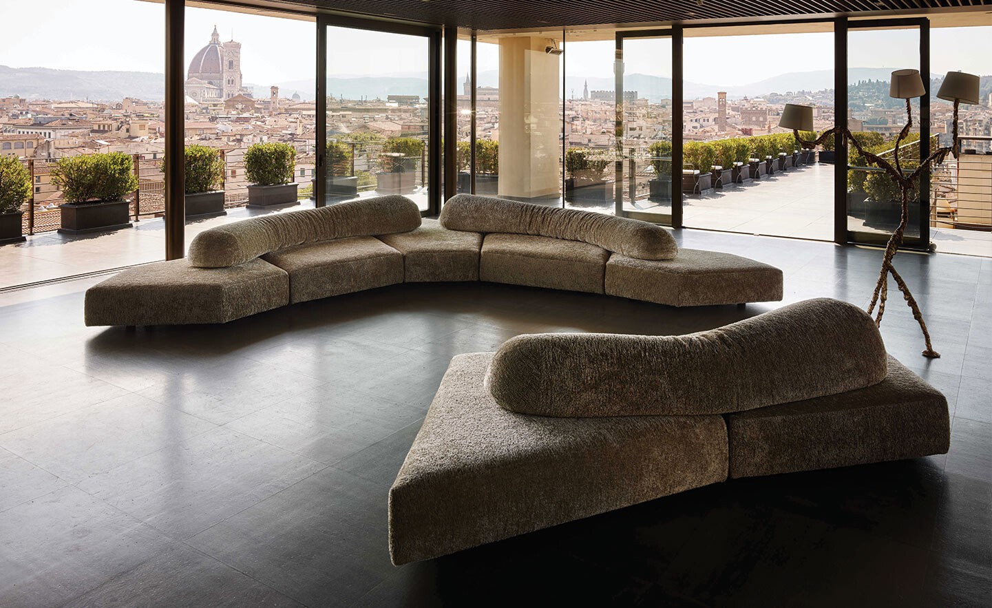 Ο καναπές/πολυθρόνα On the Rocks του Francesco Binfaré, που εξυπηρετεί τους χώρους υποδοχής, στερείται σταθερού σκελετού! Πρόκειται, ουσιαστικά, για ανεξάρτητα γεωμετρικά σχήματα που θυμίζουν τεράστια κομμάτια πάγου ή βράχους που έχουν λαξευτεί από τον άνεμο. Η δυνατότητα να διαμορφώνεται ελεύθερα στον χώρο αντανακλά την ευελιξία του σύγχρονου design, προσφέροντας διαφορετικές γωνίες θέασης, όπως ακριβώς μια κορυφή βουνού, ως σύμβολο της Κορτίνα.